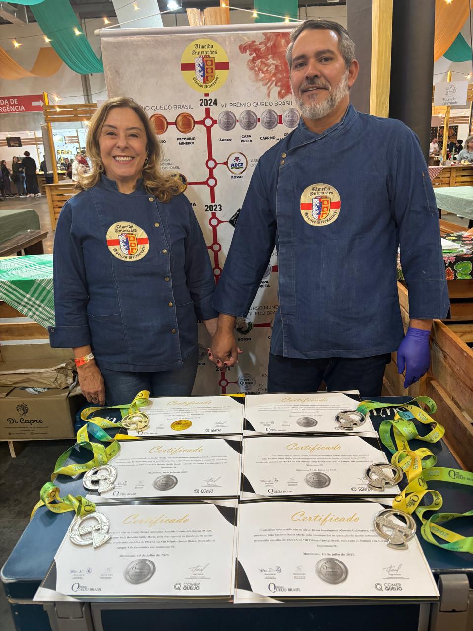 À frente estão Luiz Antônio Guimarães e Adriana Maria de Almeida, que produzem seus queijos no Sítio Recanto Santa Maria. Fundada em 2014, a queijaria carrega a união de duas famílias tradicionais da região — Almeida e Guimarães — transformando tradição em propósito.